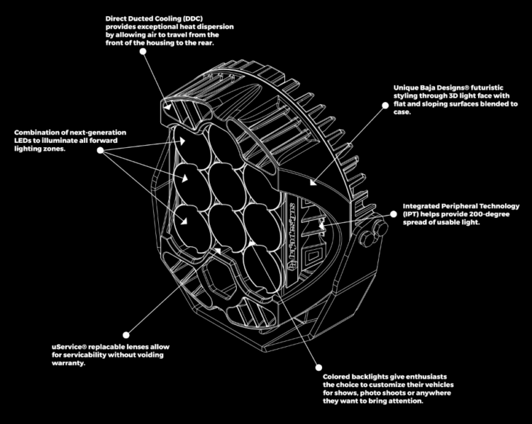 Unikalne, futurystyczne wzornictwo Baja Designs — wykorzystujące trójwymiarowy front świetlny z połączeniem płaskich i pochylonych powierzchni — nadaje modelom LP9, LP6 i LP4 charakterystyczny wygląd, niespotykany w jakichkolwiek innych lampach dostępnych obecnie na rynku.