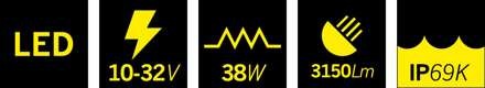 - Wysoka moc światła – 3150 lumenów zapewnia jasne, szerokie i efektywne oświetlenie otoczenia.